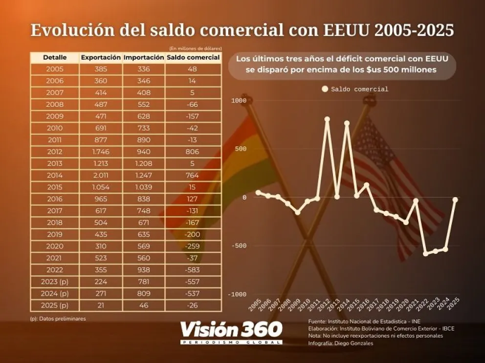 Desde 2005, salvo ese año, 2006, 2007 o 2012, 2013, 2014, 2015 y 2016 la balanza comercial de Bolivia con EEUU, ha sido negativa.