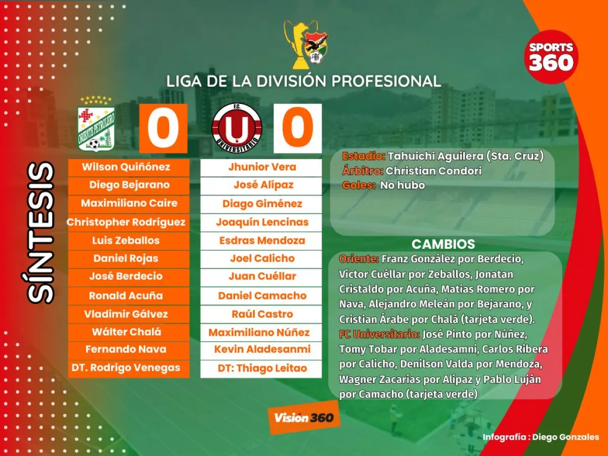 Oriente Petrolero no pudo en condición de local contra FC Universitario y empataron sin goles este jueves en el estadio Tahuichi Aguilera de Santa Cruz, en el inicio de la segunda fecha del Torneo Liga de la División Profesional.