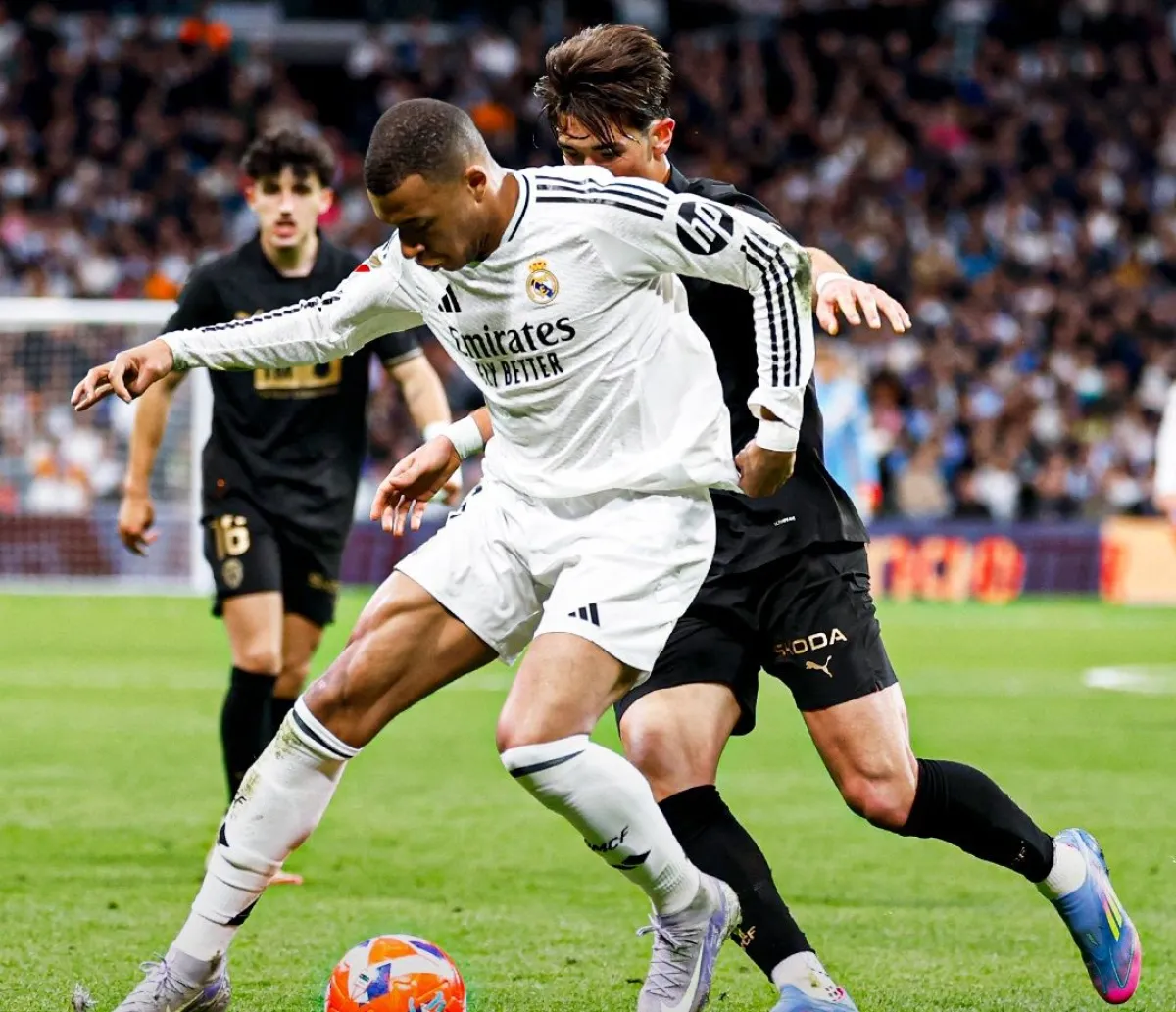 Mbappé (de blanco) domina la pelota ante la marca de un rival. Foto: Real Madrid.