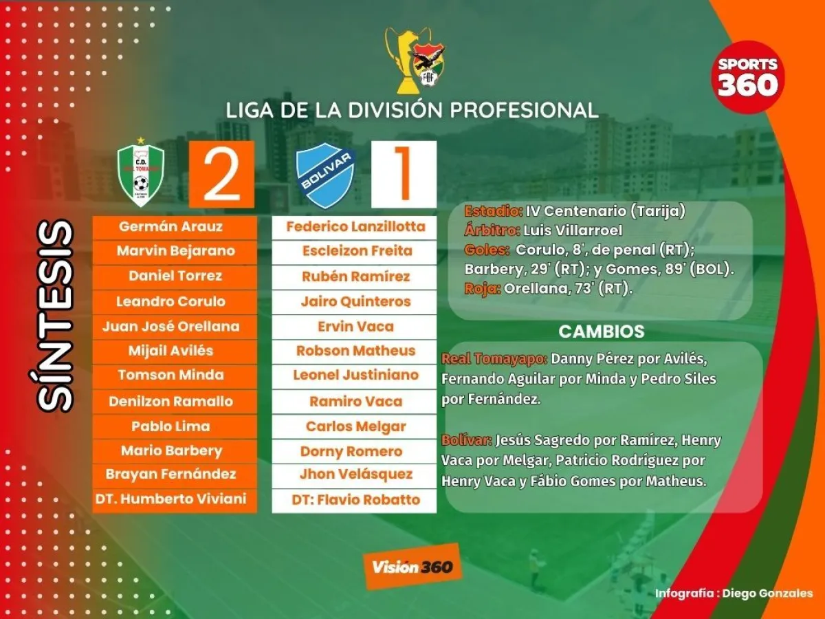 Tomayapo se quedó con 10 hombres por la expulsión de Juan José Orellana al ver dos amarillas (73’), lo que hizo que Bolívar sea más incisivo en la zona ofensiva.