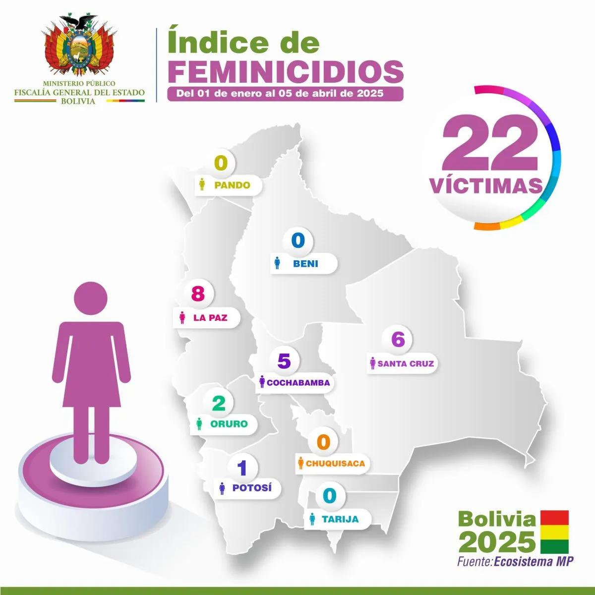 El resto de los departamentos, Pando, Beni, Tarija y Chuquisaca no presentan casos que hayan sido registrados por el Ministerio Público.