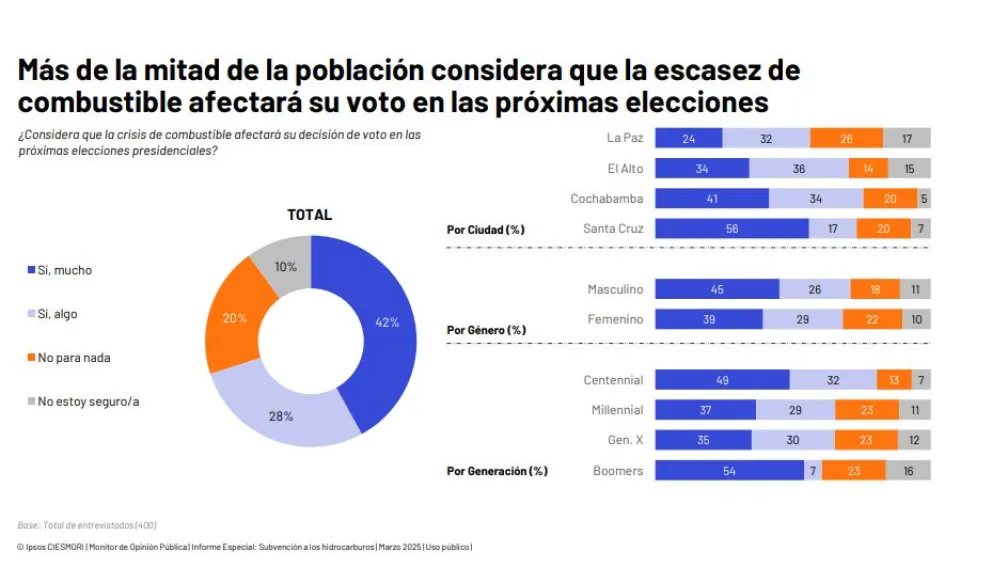 "Más de la mitad de la población considera que la escasez de combustible afectará su voto en las próximas elecciones presidenciales", señala entre sus conclusiones el informe especial del monitor de opinión Ciesmori. Según su última encuesta, el 42% de los consultados afirma que la crisis de combustible influirá mucho en su decisión al momento del voto, a lo que se suma que otro 28% dice que dicha situación influirá "algo".