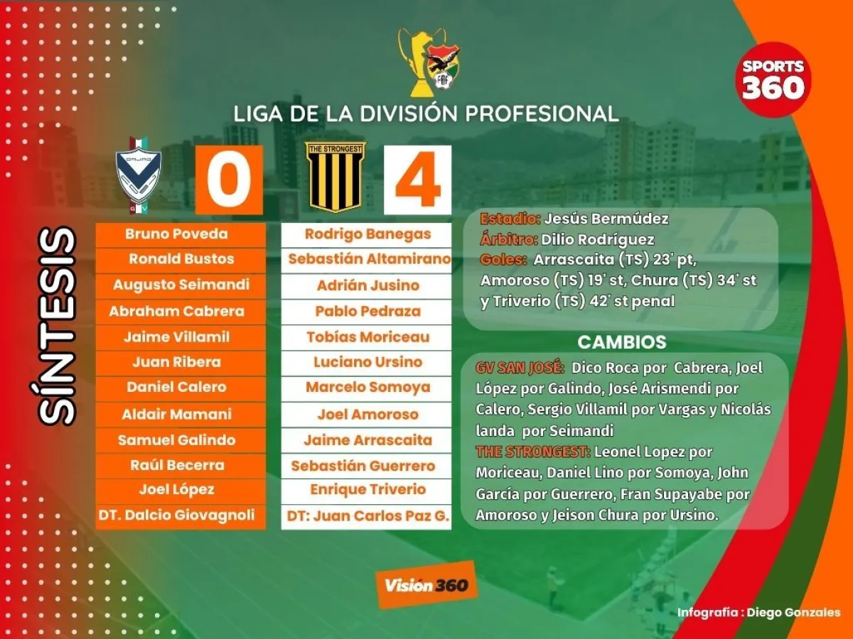 The Strongest mostró otra faceta en Oruro y sumó su segundo triunfo del campeonato al golear esta tarde a GV San José por 4-0, en partido que se jugó en el estadio Jesús Bermúdez por la tercera fecha del torneo todos contra todos.