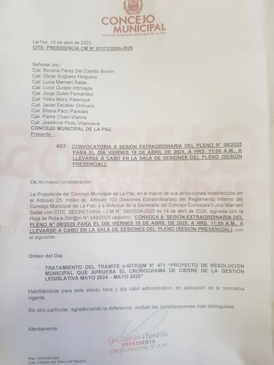 Mediante una carta, a la que tuvo acceso Visión 360, la presidenta del Concejo Municipal de La Paz, Lourdes Chambilla, convocó a una sesión para la mañana de este 18 de abril, el feriado de Viernes Santo. Según el comunicado, se tratará el cronograma de cierre de gestión.