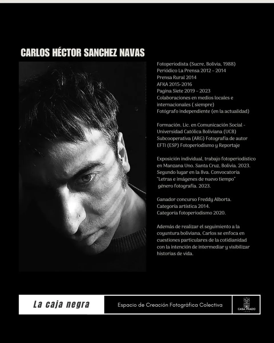 Carlos Sánchez nació en Sucre, es comunicador social y cuenta con una larga trayectoria en medios de comunicación y colaboraciones con agencias y revistas internacionales; realizó exposiciones sobre su trabajo, el cual recibió reconocimientos y galardones en diferentes gestiones.