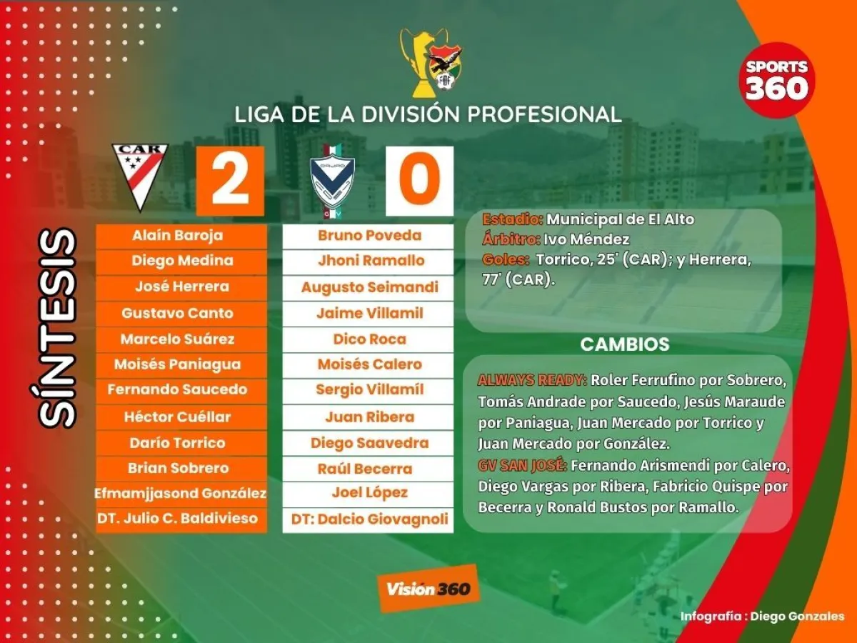 Always Ready sumó su cuarto triunfo consecutivo y es único líder con puntaje perfecto en el torneo Liga de la División Profesional tras el triunfo que tuvo este sábado sobre Gualberto Villarroel San José (2-0) en el estadio Municipal de El Alto.