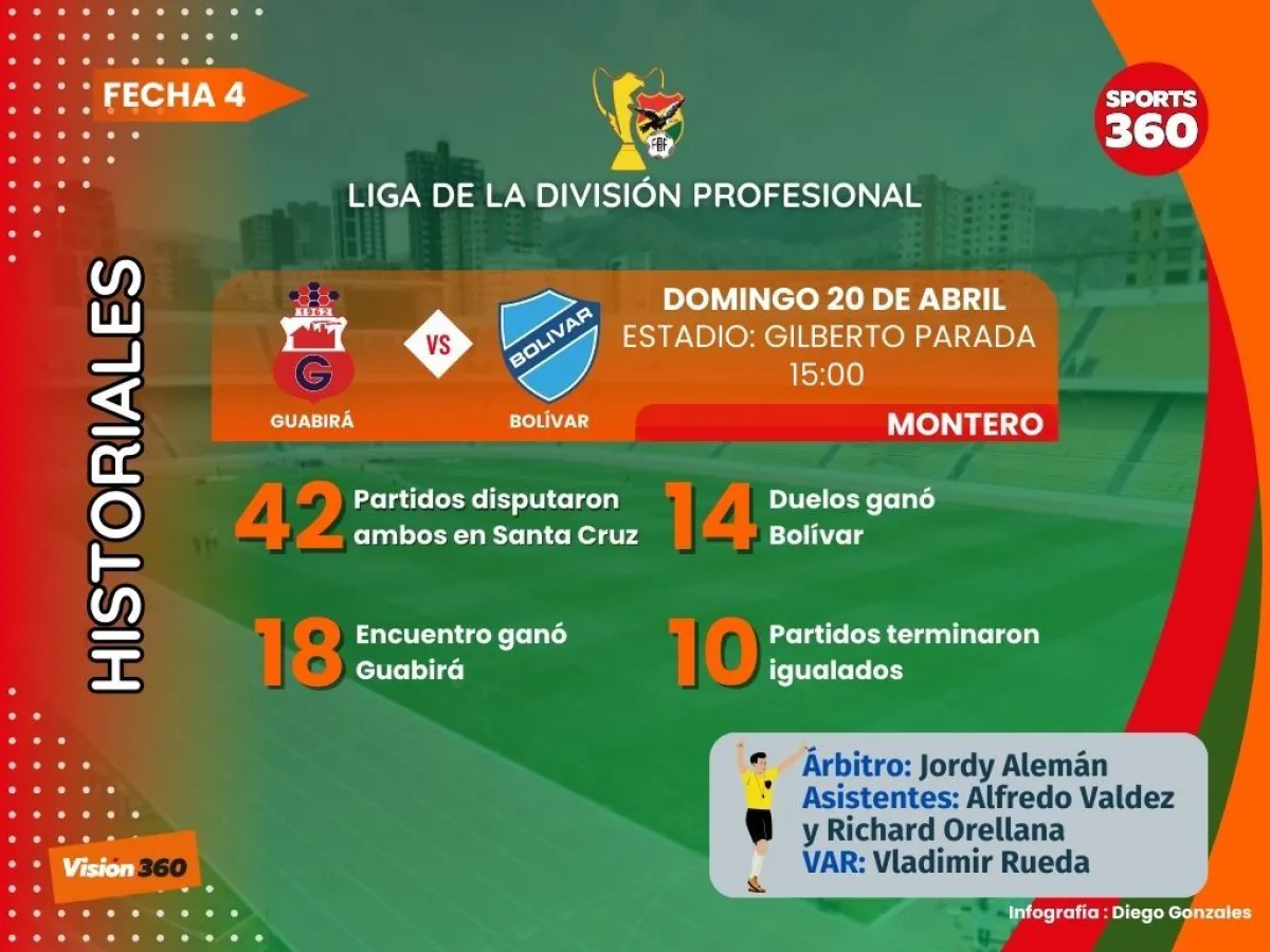 Con el objetivo de no perderle pisada a los que están en la cima del torneo Liga de la División Profesional, Bolívar visitará a Guabirá, este domingo (15.00) en el estadio Gilberto Parada de Montero por la cuarta fecha del campeonato.