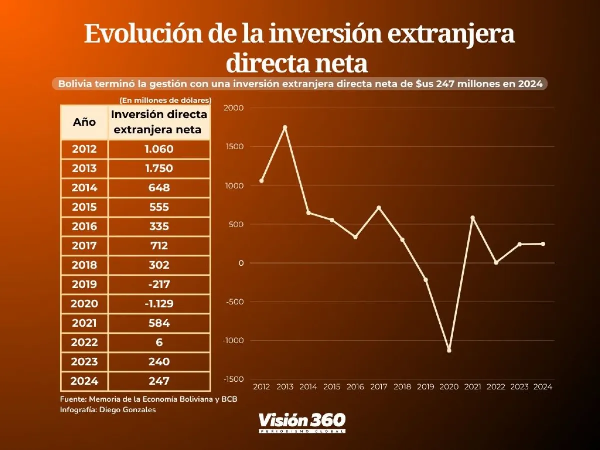 Bolivia registró un flujo de inversión extranjera directa de $us 247 millones en 2024, un 85,9% menos que en 2013