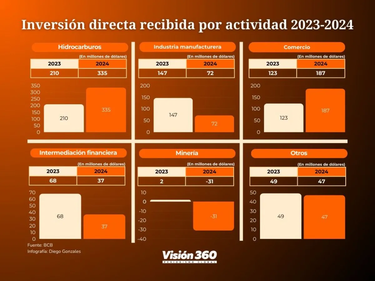 “La Inversión Directa Neta recibida registró un flujo positivo de 247 millones de dólares, resultado superior a 2023. Este comportamiento se explica principalmente por las utilidades reinvertidas de los sectores de hidrocarburos e industria manufacturera. Por su parte, la desinversión observada fue menor a la registrada en la gestión 2023”, precisa el BCB en su reporte.
