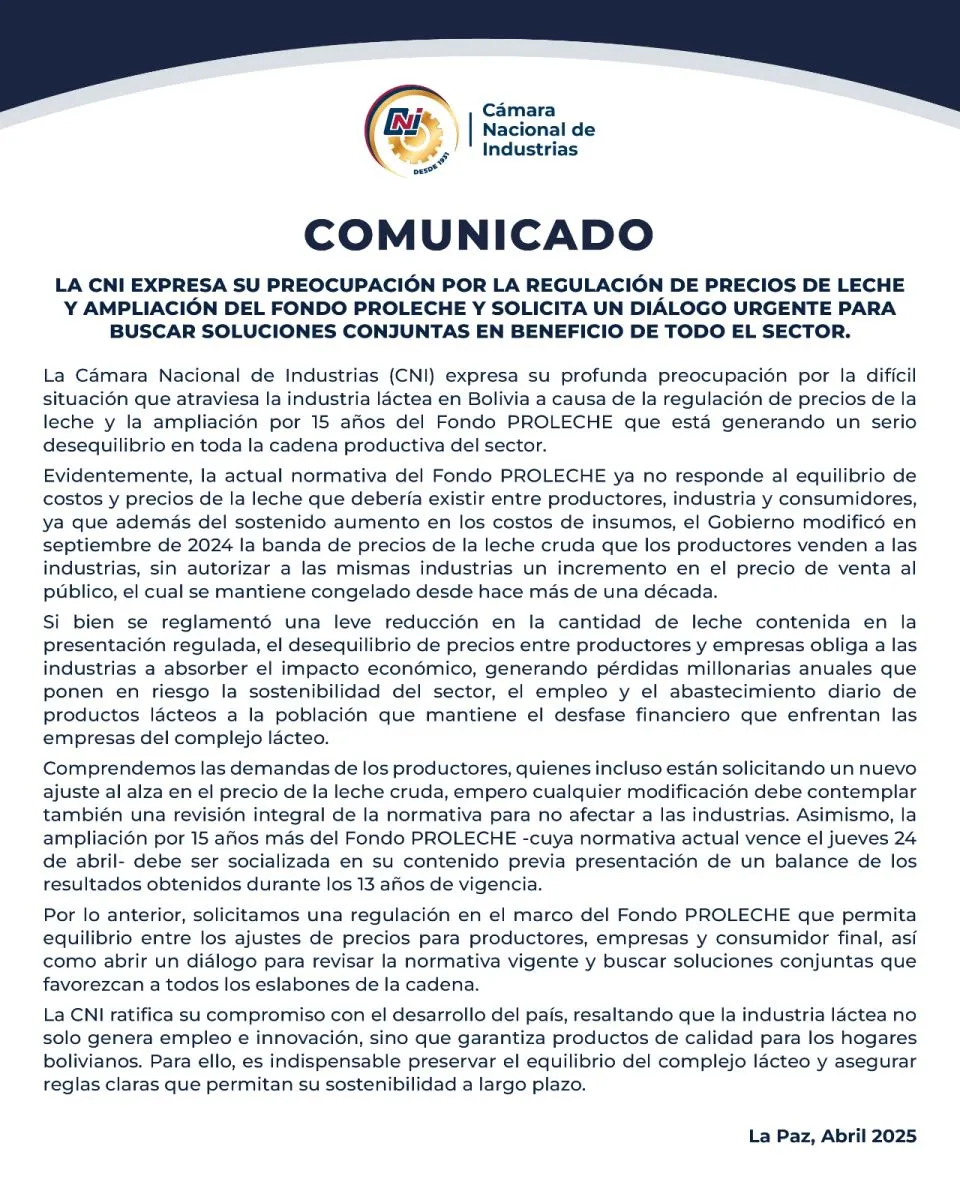 La Cámara Nacional de Industrias (CNI), mediante un comunicado, solicitó la revisión de la normativa del Fondo Proleche con el objetivo de equilibrar el precio para productores, empresas y consumidores finales del producto.