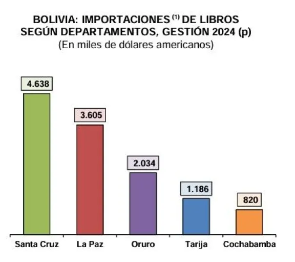 Los principales importadores de libros, con compras que superaron los $us 8.000 en conjunto, fueron Santa Cruz ($us 4.638) y La Paz ($us 3.605) durante 2024, seguido de Oruro, Tarija y Cochabamba.