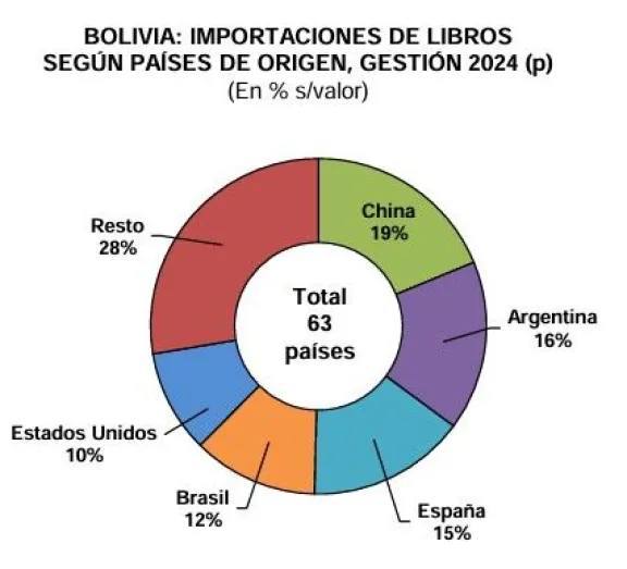 De acuerdo con esta entidad privada, en la gestión 2024 China fue el principal proveedor de libros, con un 19% del total de las importaciones bolivianas, seguido de Argentina (16%) y España (15%).
