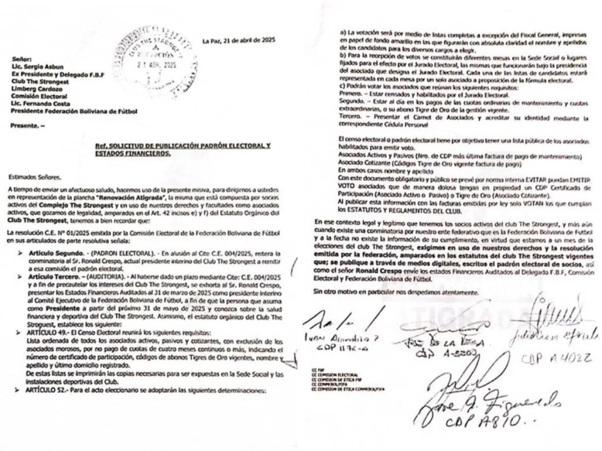 Renovación Atigrada, que tiene como candidato a la presidencia a Cristhian Ovando, en el documento señala que “amparados en el Art. 42, incisos e y f del Estatuto Orgánico del Club The Strongest” y también tomando en cuenta la resolución C.E. N° 01/2025 emitida por la Comisión Electoral de la FBF, solicita que se cumpla la “conminatoria al Sr. Ronald Crespo, actual presidente interino del club The Strongest, a remitir el padrón electoral” y también a “presentar los Estados Financieros Auditados al 31 de marzo de 2025”.