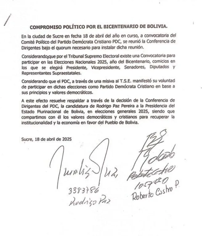 El acuerdo entre el PDC y Paz, líder de Primero la gente, fue firmado el pasado 18 de abril, en la ciudad de Sucre, Chuquisaca, debido a que comparten valores democráticos y cristianos para recuperar la institucionalidad y la economía a favor del pueblo.