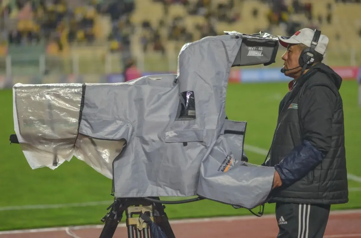 Un camarógrafo de Fútbol Canal con la cámara de piso en el estadio Hernando Siles. Foto: Agencia Marka Registrada