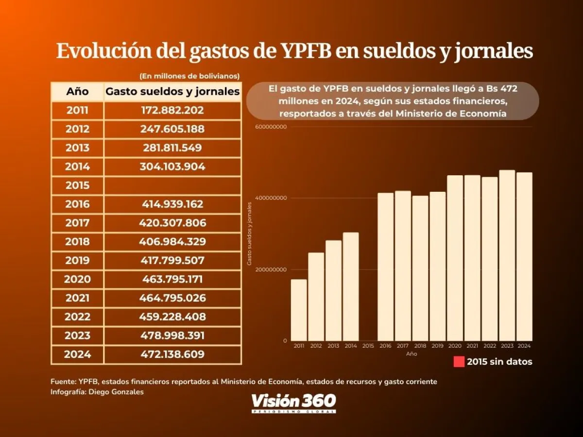 El economista Julio Lineras dijo que en 2006 el gasto en servicios personales de YPB apenas llegaba a Bs 70 millones y subió a casi Bs 600, incluyendo a subsidiarias. En 2011 el gasto en sueldos y salarios era de Bs 172,8 millones y en 2024, 472,1.
