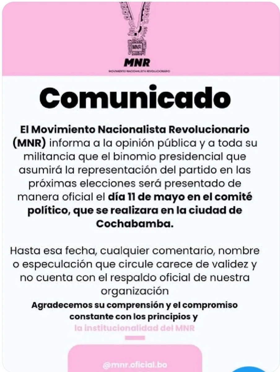 Ayer, martes, circularon en las redes falsos comunicados, por lo que el MNR publicó también una aclaración en la que señala que sus candidatos serán presentados el 11 de mayo, luego de un comité político que se llevará a cabo en Cochabamba.