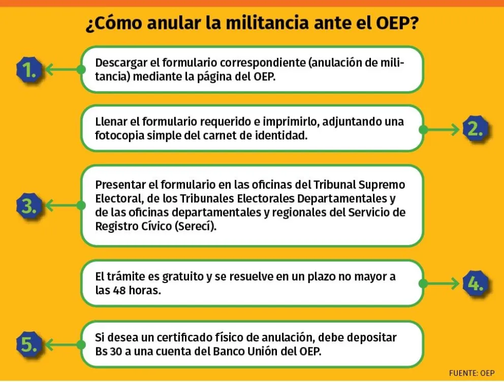 Diariamente, docenas de personas van al TSE, con formularios de anulación de militancia y una fotocopia simple del carnet de identidad, para realizar este trámite, según uno de los guardias de seguridad de las oficinas del organismo electoral. Hasta el momento, el ente electoral no dio una cifra de monto total de solicitudes. Este medio hizo la solicitud a los vocales, pero no tuvo éxito.