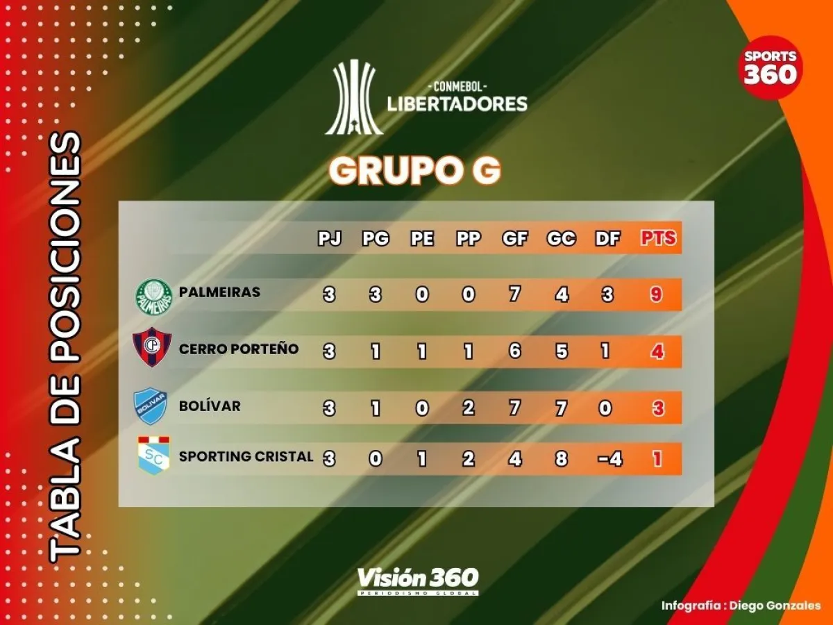 Gracias a este resultado el conjunto guaraní se ubica segundo con 4 puntos. Solo tiene uno más que Bolívar (3), mientras que el brasileño Palmeiras es cómodo líder (9) y Sporting Cristal está en la cola (1).