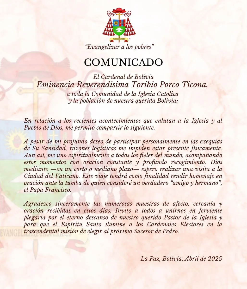 “A pesar de mi profundo deseo de participar personalmente en las exequias de su Santidad, razones logísticas me impiden estar presente físicamente”, señala un comunicado publicado por la Conferencia Episcopal de Bolivia (CEB).