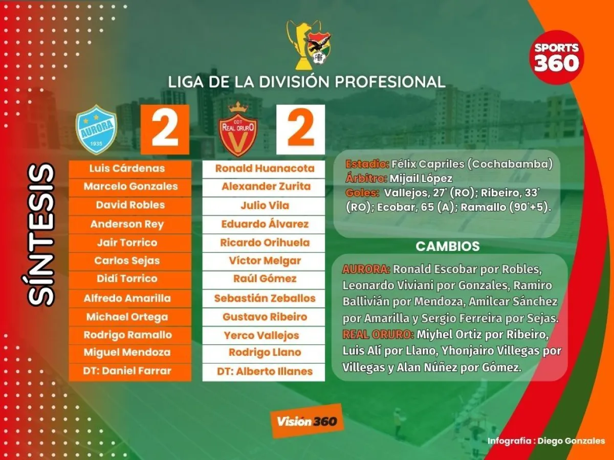 Aurora le perdonó la vida a Real Oruro, fue absolutamente superior, pero solo pudo empatar (2-2) en el partido con el que inició la quinta jornada de la Liga de la División Profesional, que se jugó en la tarde-noche del viernes en el estadio Félix Capriles de Cochabamba.