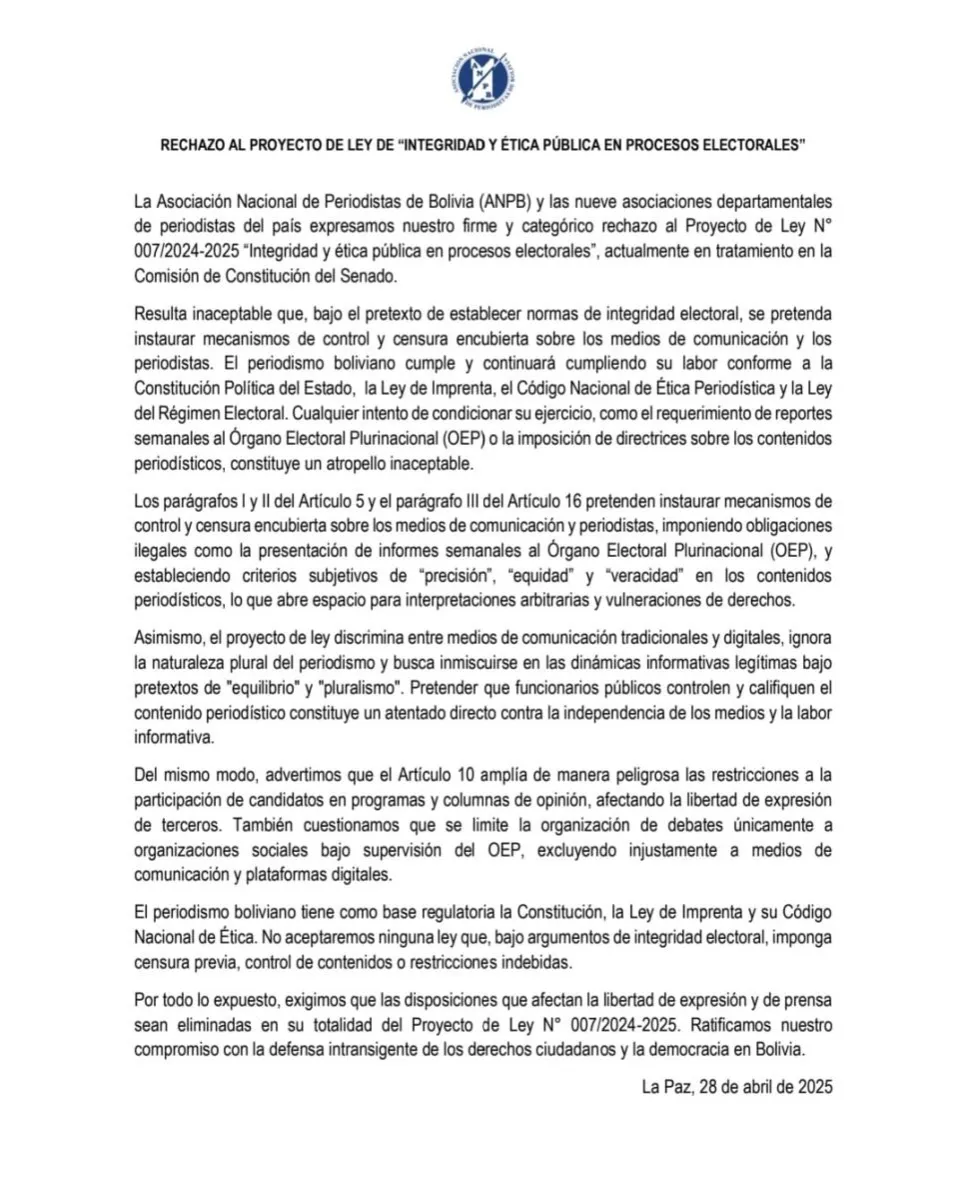 “El periodismo boliviano tiene como base regulatoria la Constitución, la Ley de Imprenta y su Código Nacional de Ética. No aceptaremos ninguna ley que, bajo argumentos de integridad electoral, imponga censura previa, control de contenidos o restricciones indebidas”, recuerdan.