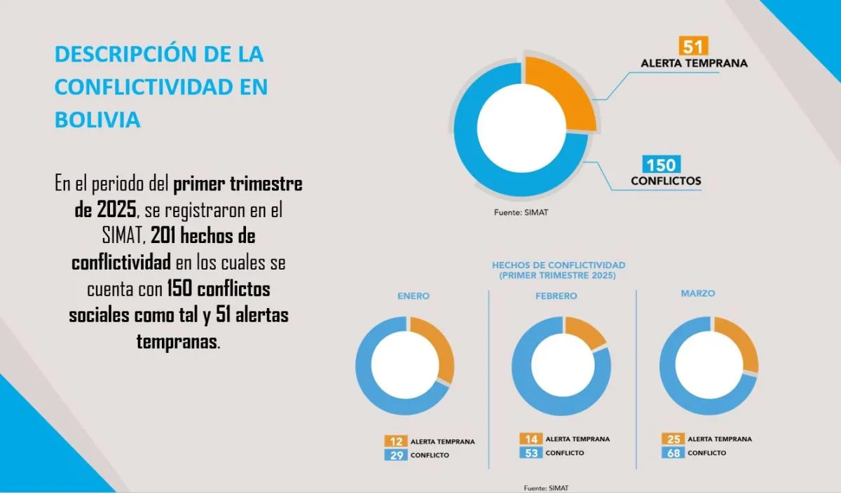 La Defensoría del Pueblo publicó este lunes el “comportamiento de la conflictividad en Bolivia”, en un informe que establece un total de 201 conflictos en el país durante el primer trimestre del año. El departamento de La Paz fue el más afectado.