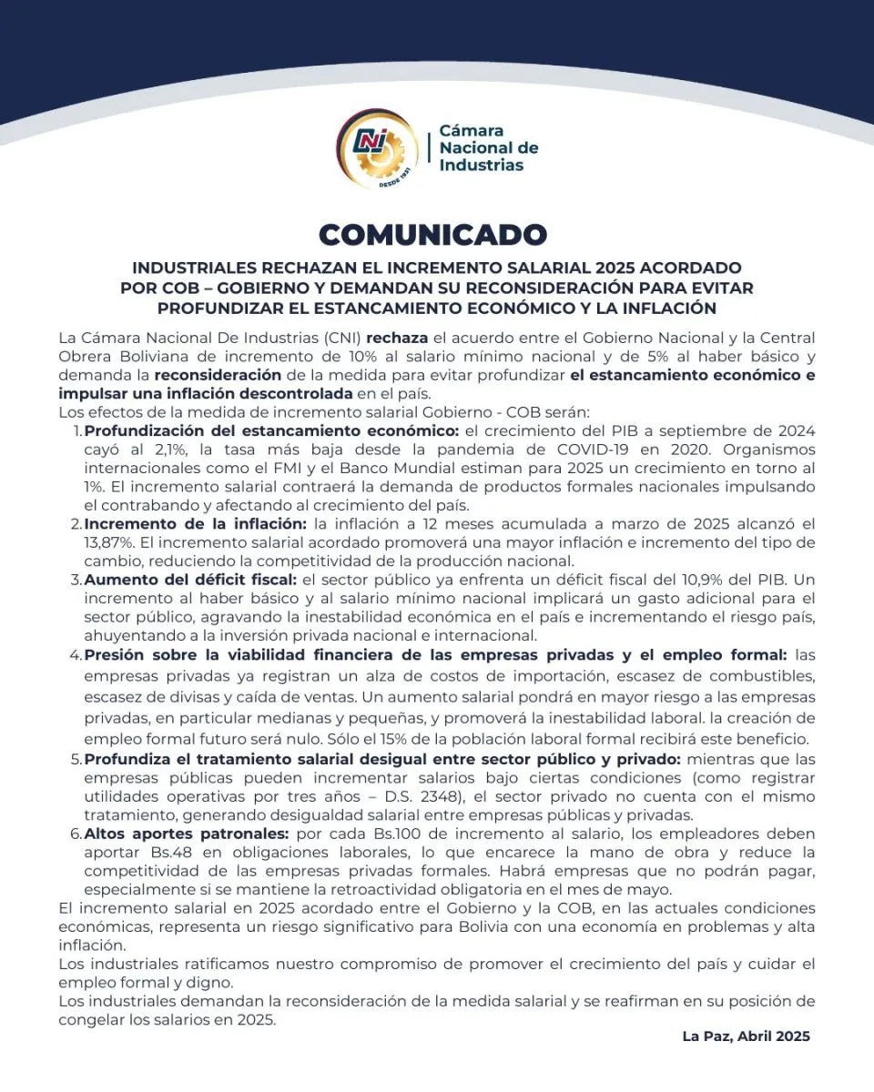 “El incremento salarial en 2025, en las actuales condiciones económicas, representa un riesgo significativo para Bolivia con una economía en problemas y alta inflación”, se lee en la parte final del comunicado.