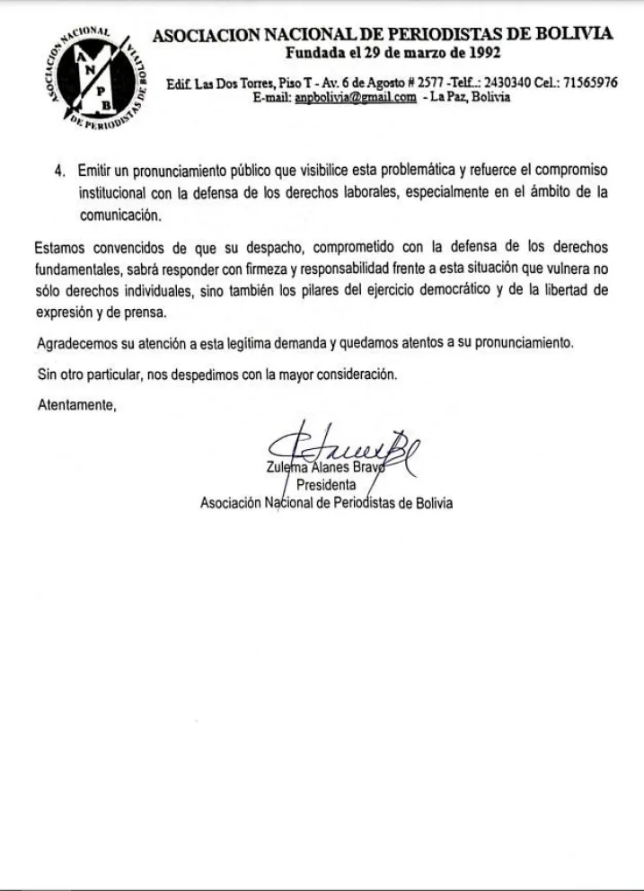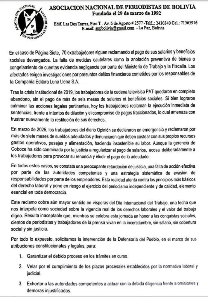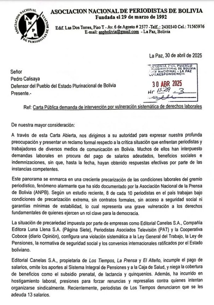 Mediante una carta pública, la Asociación Nacional de Periodistas de Bolivia (ANPB) exige a la Defensoría del Pueblo su intervención "inmediata" ante la grave y sostenida vulneración de los derechos laborales de los periodistas y trabajadores de distintos medios de comunicación en el país.