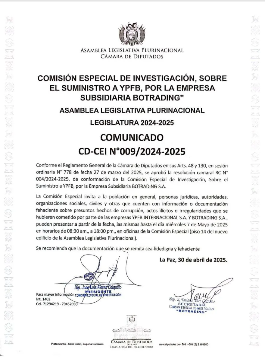 “La comisión especial invita a la población, personas jurídicas, autoridades, organizaciones sociales, civiles y otras que cuenten con información o documentación fehaciente sobre presuntos hechos de corrupción, actos ilícitos o irregularidades que se hubieren cometido por parte de las empresas YPFB Internacional S.A. y Botrading S.A pueden presentar a partir de la fecha, las mismas hasta el día miércoles 7 de mayo de 2025 en horarios de 8.30 a 18.00”, se informó mediante un comunicado, firmado por el diputado José Luis Flores, del MAS, presidente de esa comisión.