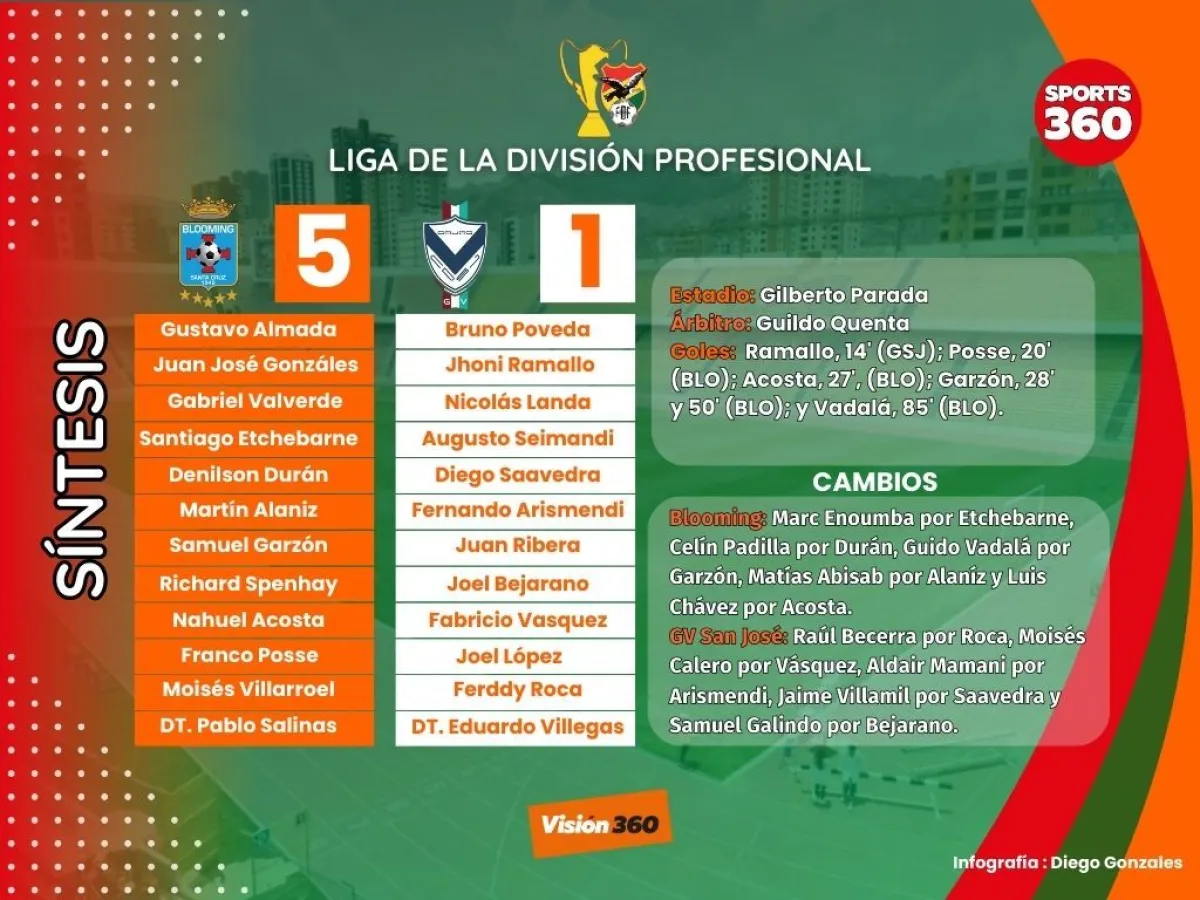 GV San José se puso en ventaja con el tanto de Jhoni Ramallo (14’), pero luego se produjo la remontada de Blooming con Franco Posse (20’), Nahuel Acosta (27’), Samuel Garzón (28’ y 50’) y Guido Vadalá (85’').