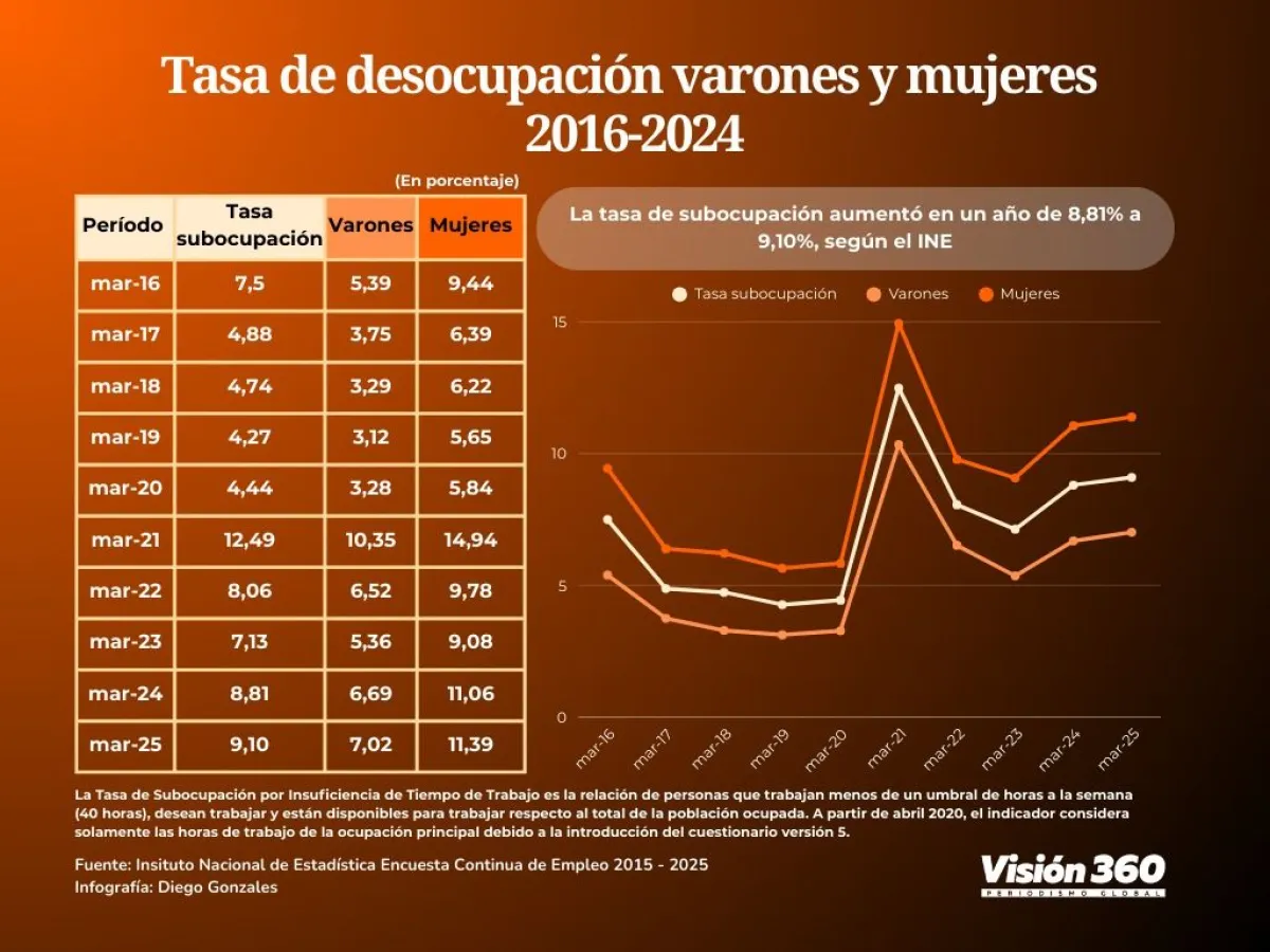 La tasa de subempleo de las mujeres es más alta y afecta al 11,39% de la población y en los varones la tasa es de 7,02%.