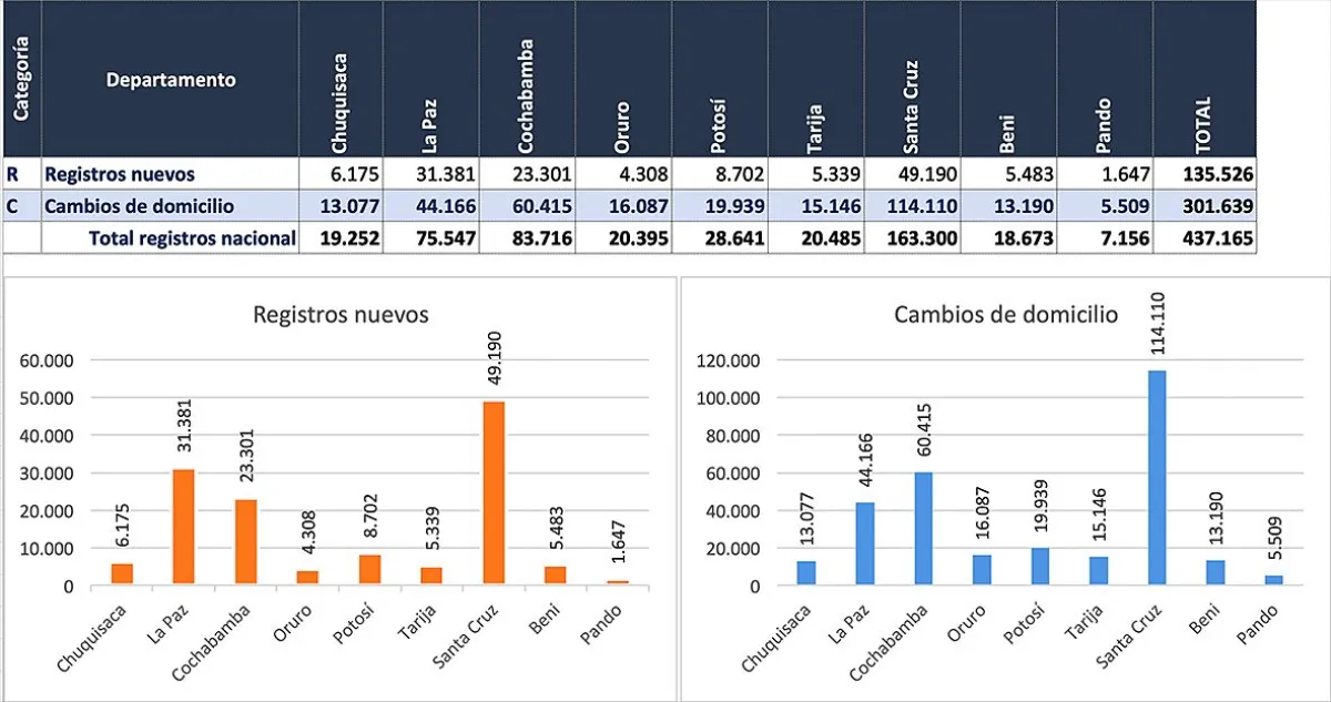 Del total registrado en el territorio nacional, 135.526 corresponden a nuevas inscripciones al Padrón Electoral Biométrico —es decir, ciudadanas y ciudadanos que se registran por primera vez—, mientras que 301.639 registros corresponden a actualizaciones por cambio de domicilio. La mayor concentración de estos registros se observa en los departamentos del eje troncal: La Paz, Cochabamba y Santa Cruz, donde se registra una alta demanda de atención en los distintos puntos habilitados.
