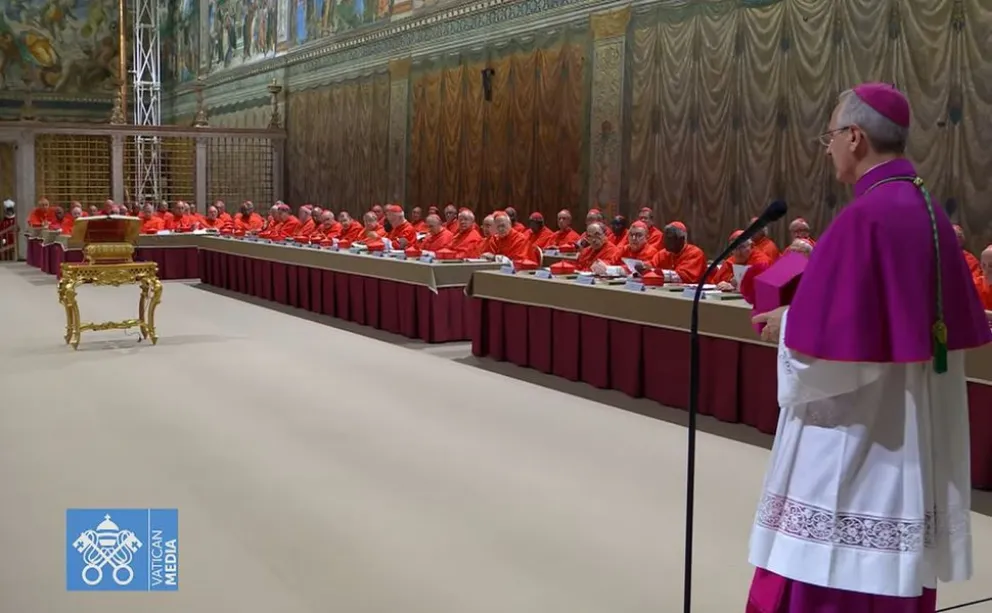 Momento en que piden desocupar el recinto para que se queden solo los cardenales. Foto: Vatican News