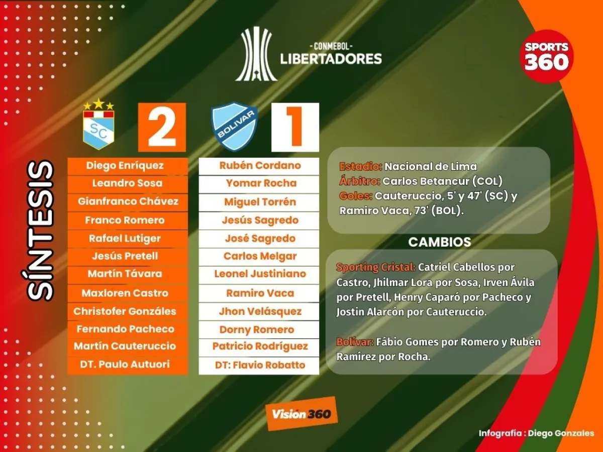 En Perú, los dos goles locales se dieron en los primeros minutos de cada tiempo, ambos del uruguayo Martín Cauteruccio (5’ y 47’), en tanto que Bolívar descontó con un golazo de Ramiro Vaca (73’), su quinto tanto en lo que va de la Copa.