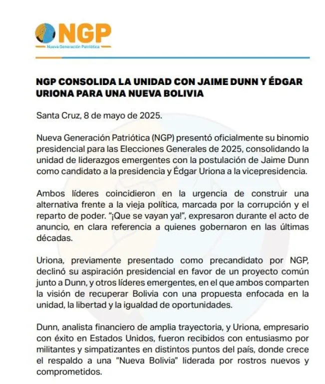 "Uriona, previamente presentado como precandidato por NGP, declinó su aspiración presidencial en favor de un proyecto común junto a Dunn, y otros líderes emergentes, en el que ambos comparten la visión de recuperar Bolivia con una propuesta enfocada en la unidad, la libertad y la igualdad de oportunidades", agrega el comunicado.