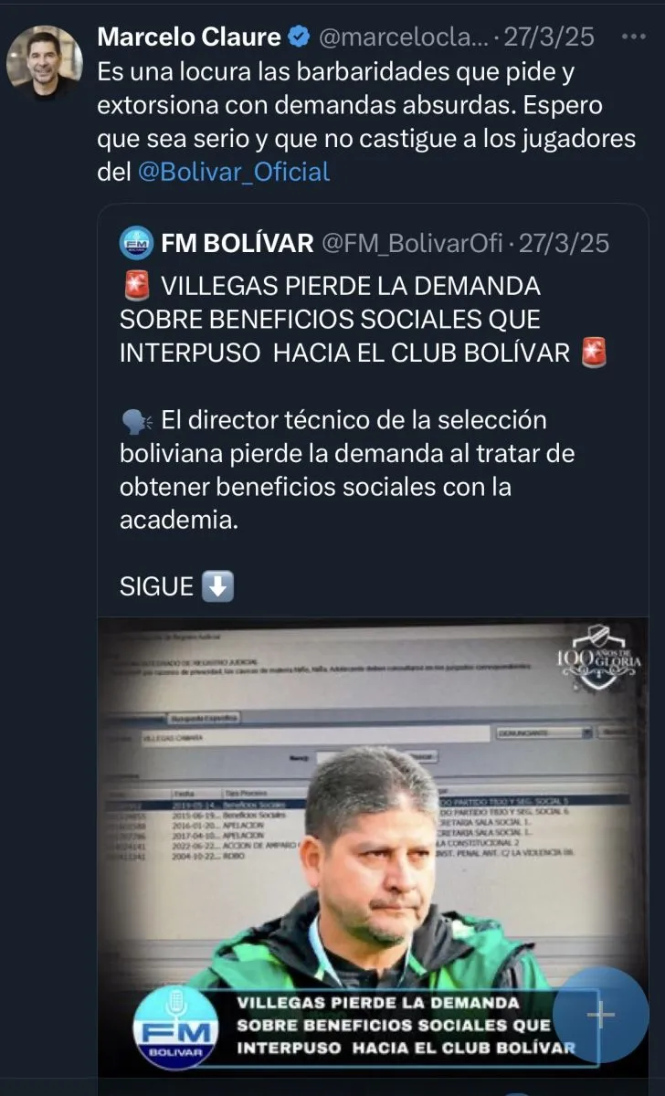 Claure escribió el siguiente texto: “Es una locura las barbaridades que pide y extorsionan con demandas absurdas. Espero que no castigue a los jugadores del @Bolivar_Oficial”.