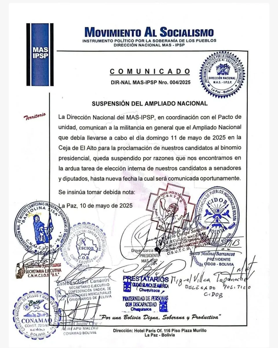 “La Dirección Nacional del MAS-IPSP, en coordinación con el Pacto de Unidad, comunican a la militancia en general que el Ampliado Nacional que debía llevarse a cabo el día domingo 11 de mayo de 2025 en la Ceja de El Alto para la proclamación de nuestros candidatos al binomio presidencial, queda suspendido por razones que nos encontramos en la ardua tarea de elección interna de nuestros candidatos a senadores y diputados, hasta nueva fecha la cual será comunicada oportunamente”, dice el comunicado presentado por el MAS.