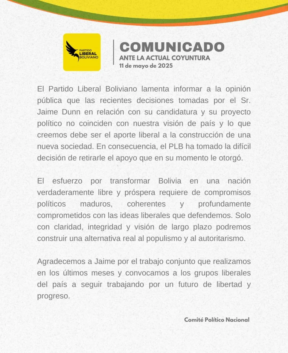 “El PLB lamenta informar a la opinión pública que las recientes decisiones tomadas por el señor Jaime Dunn en relación con su candidatura y su proyecto político no coinciden con nuestra visión de país y lo que creemos debe ser el aporte liberal a la construcción de una nueva sociedad. En consecuencia, el PLB ha tomado la difícil decisión de retirarle el apoyo que en su momento le otorgó”, dice el comunicado de esa organización.