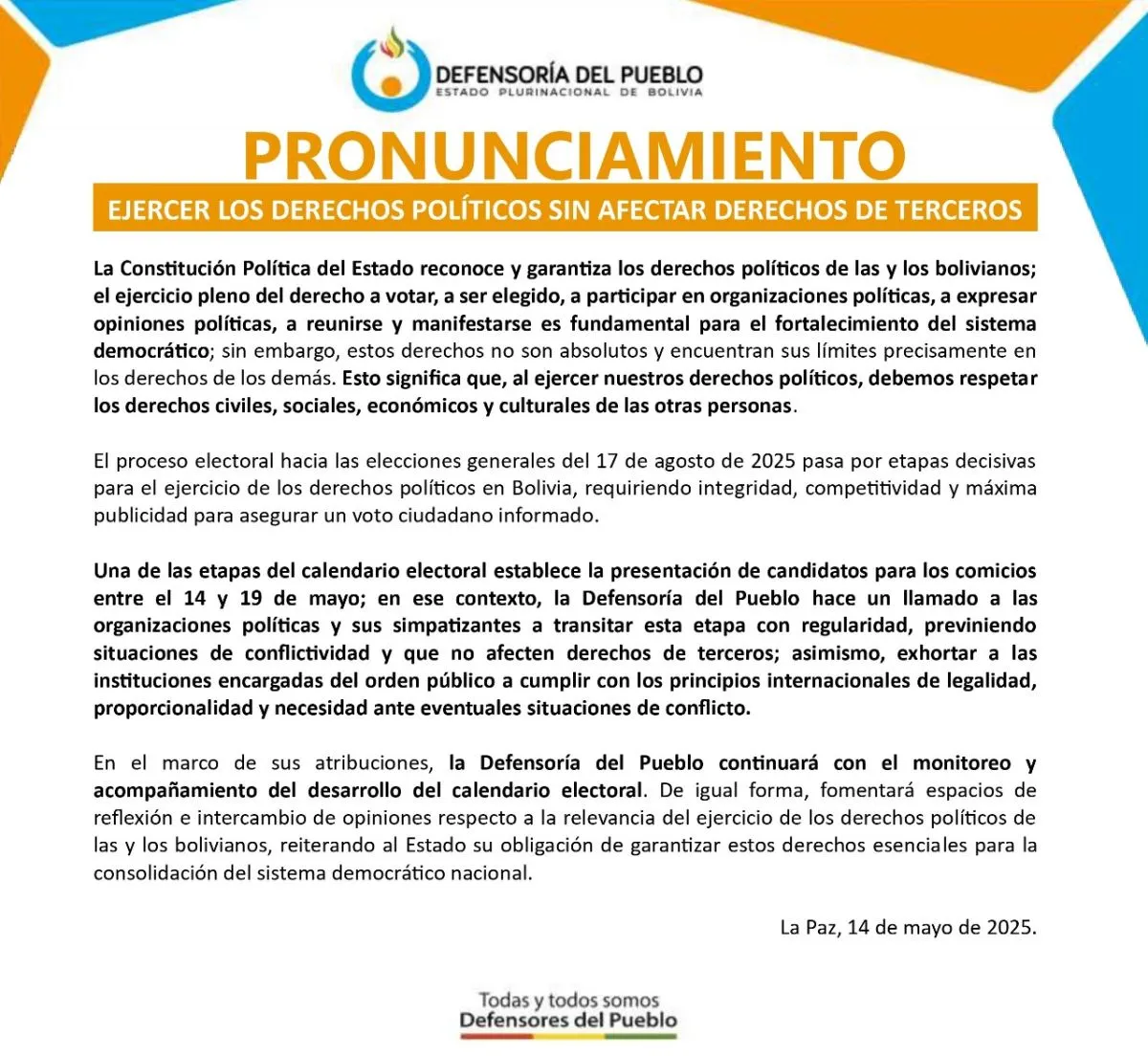 La Defensoría del Pueblo instó este miércoles a las organizaciones políticas y a sus simpatizantes a cumplir con el registro de sus candidaturas sin conflictividad. También pidió no afectar los derechos de terceros.