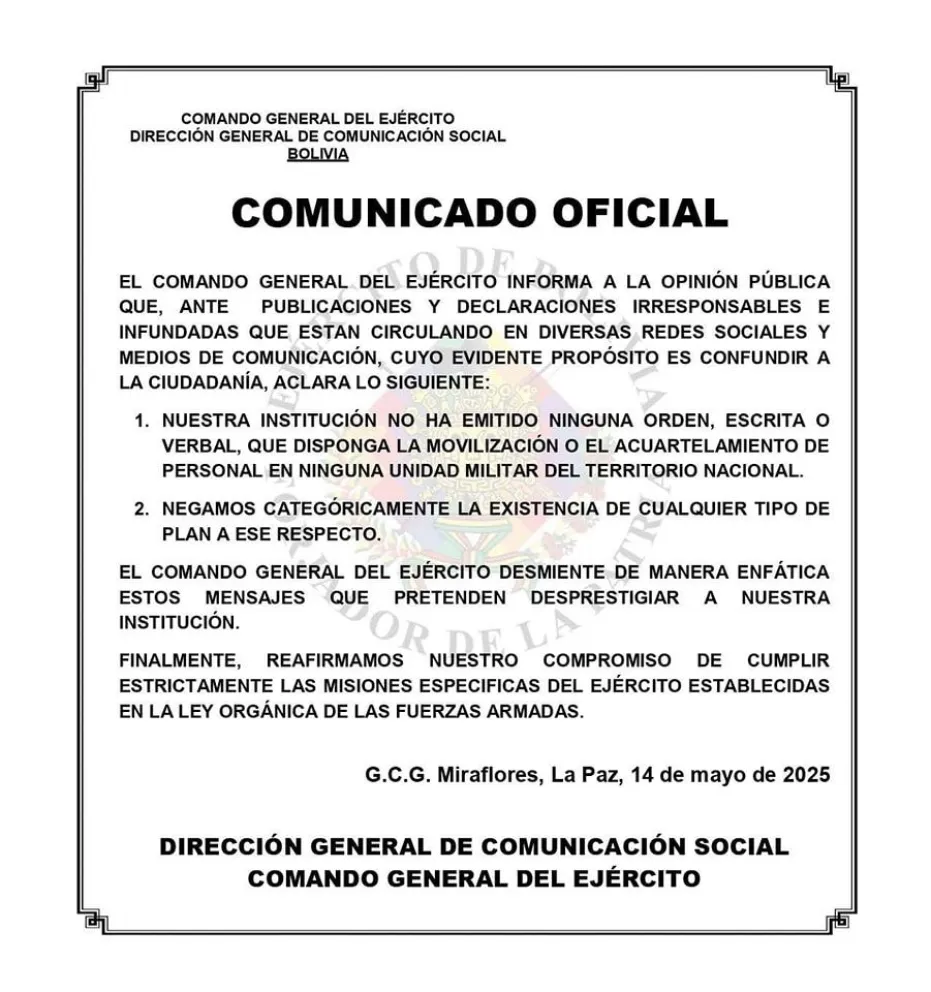 “Nuestra institución no emitió ninguna orden, escrita o verbal, que disponga la movilización o el acuartelamiento de personal en ninguna unidad militar del territorio nacional”, expresó el Comando en un comunicado difundido la noche del miércoles.