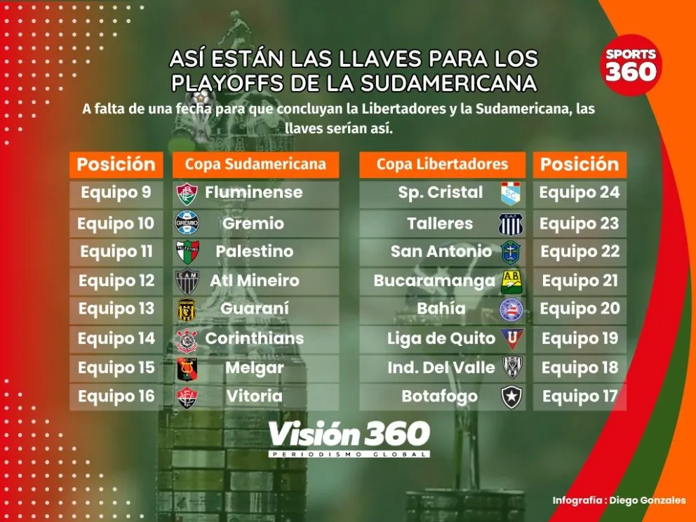 Los partidos ida y vuelta serán entre los equipos que finalicen en la segunda ubicación de la Libertadores y los elencos que concluyan en la tercera posición de la Libertadores. Los juegos serán el 16 y 23 de julio próximo.