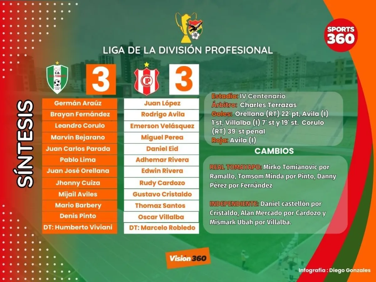 Real Tomayapo e Independiente se mataron a goles en el estadio IV Centenario al igualar a res goles por lado en un segundo tiempo en el que ambos dieron un gran espectáculo a la afición que llego a ese escenario. La victoria estuvo para cualquiera de los dos y la igualdad fue el resultado más justo en el compormiso.