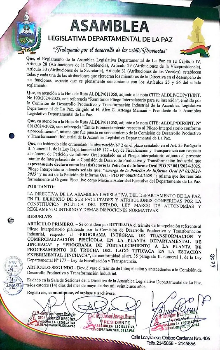 “Artículo primero.- Se considera por RETIRADO el trámite de Interpelación referente al pliego de Interpelación planteado por la Comisión de Desarrollo Productivo y Transformación Industrial, respecto al "Programa integral de transformación y comercialización piscícola en la planta departamental de Jinchaca" y "Programa de fortalecimiento a la planta de procesamiento de trucha del lago Titicaca en la estación experimental Jinchaca", de conformidad con el art. 35 párrafo II, numeral 1, de la Ley Departamental N.° 177 - Ley de Fiscalización y Transparencia. Artículo segundo.- Devuélvase el trámite de Interpelación y antecedentes a la Comisión de Desarrollo Productivo y Transformación Industrial”, señala la resolución.
