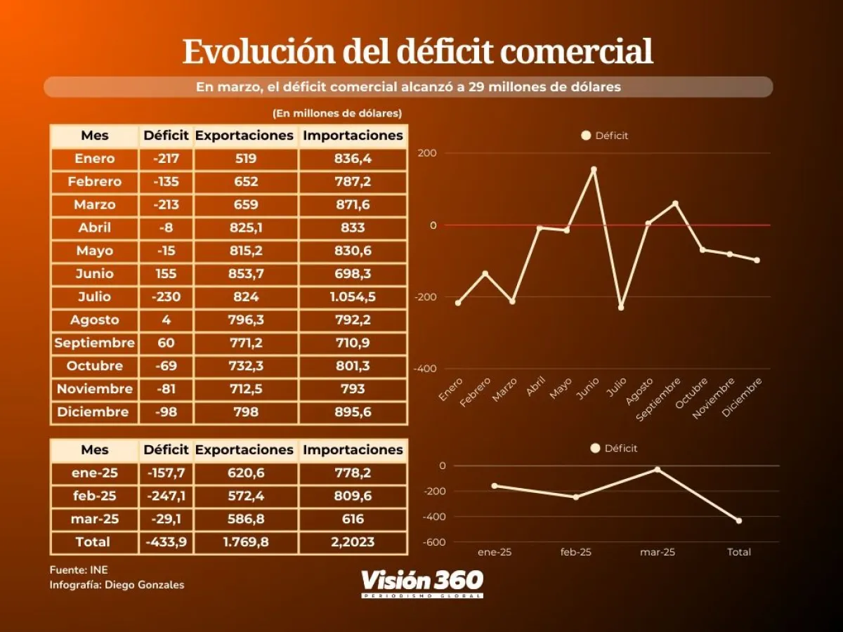 En el primer trimestre de 2025, Bolivia registró menor ingreso de divisas y las exportaciones cayeron en 8% hasta 1.761,8 millones de dólares, según datos del Instituto Nacional de Estadística (INE). El déficit comercial acumulado alcanza a 433,9 millones de dólares.