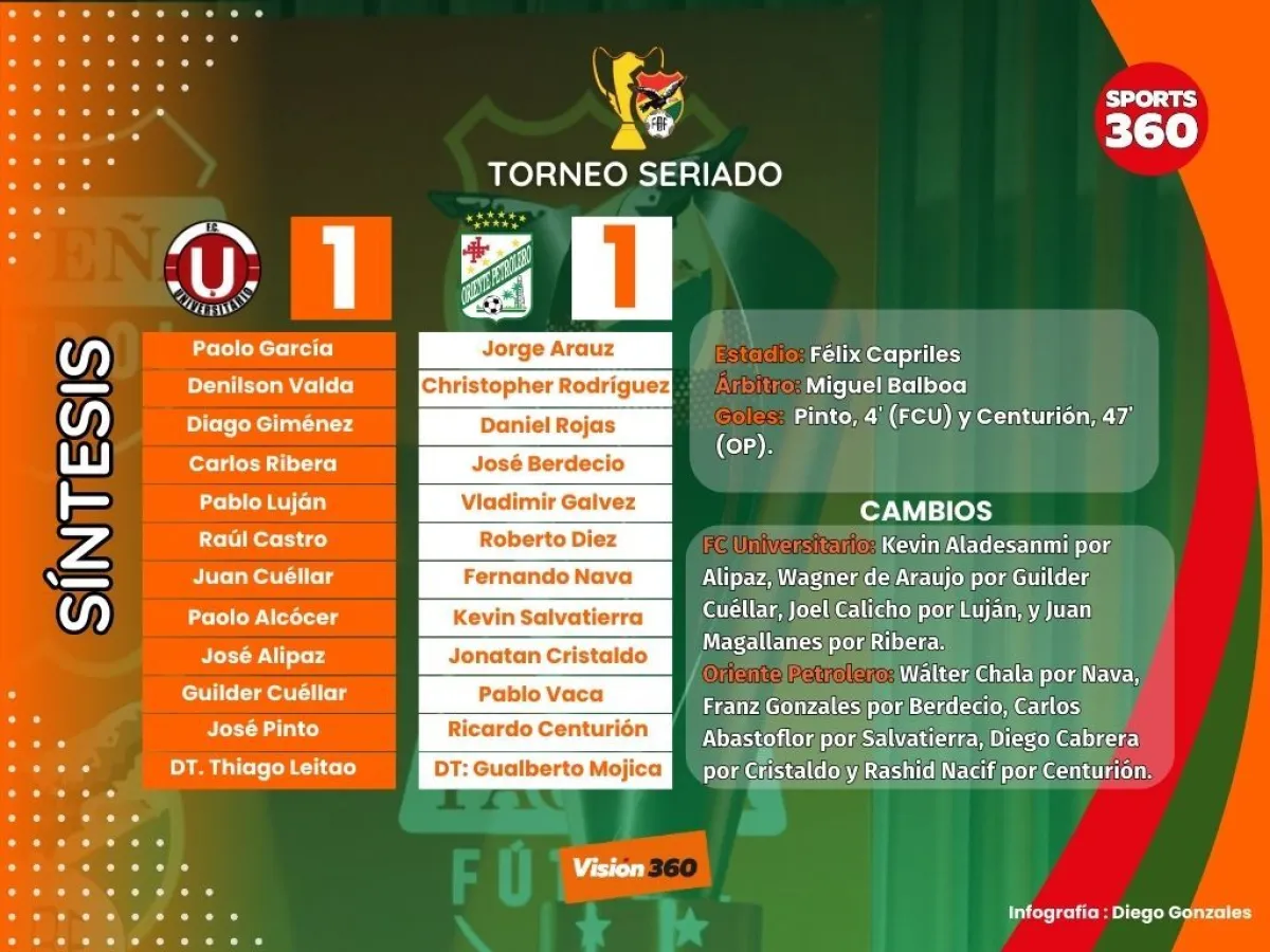 Oriente empata con FC Universitario en Cochabamba y se coloca como escolta de Guabirá