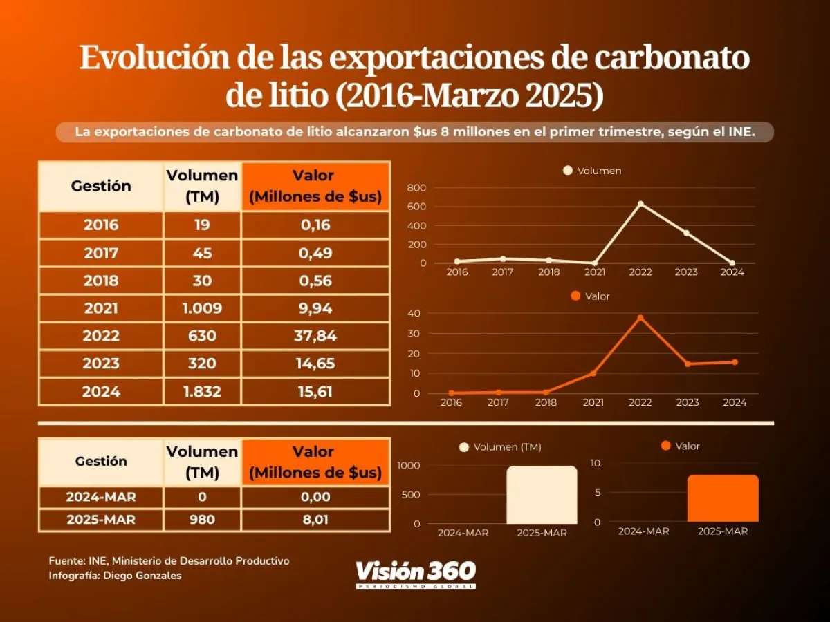 Luego de que en similar período de 2024, se reportaron cero envíos, en el primer trimestre de este año, las exportaciones de carbonato de litio alcanzaron un valor de ocho millones de dólares por el embarque de 980 toneladas, según reportó el Instituto Nacional de Estadística (INE).