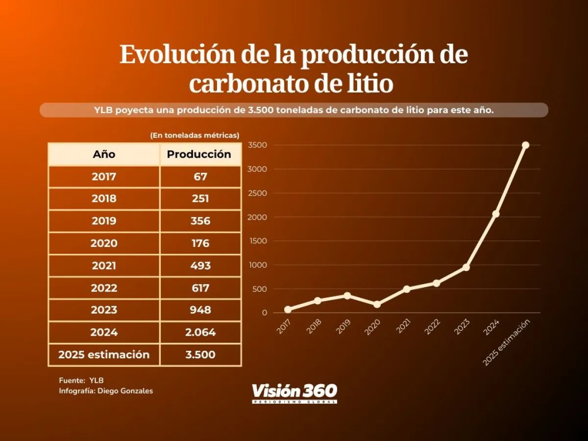 Yacimientos de Litio Bolivianos (YLB) proyecta alcanzar una producción de 3.500 toneladas métricas de carbonato de litio, lo que representa un incremento del 70% respecto a la gestión 2024.