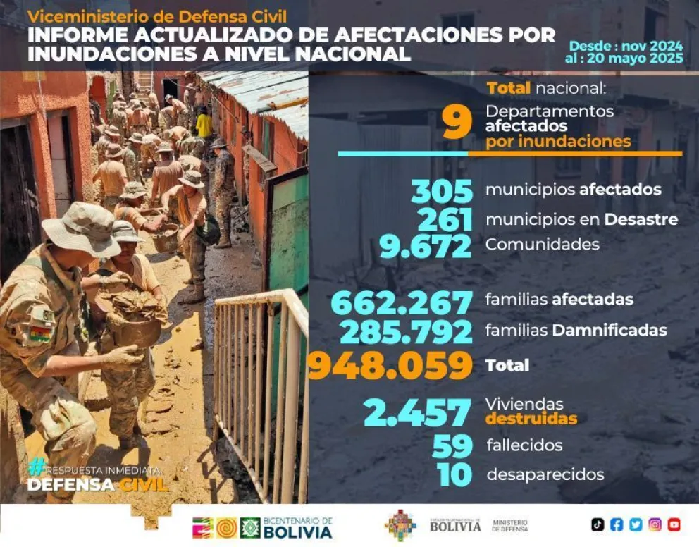 Informó que son 3.186 comunidades y 366.943 familias las afectadas y damnificadas. En tanto 12 municipios están en emergencia. “Ya tenemos el registro de dos personas fallecidas por las bajas temperaturas en Oruro”, reportó.