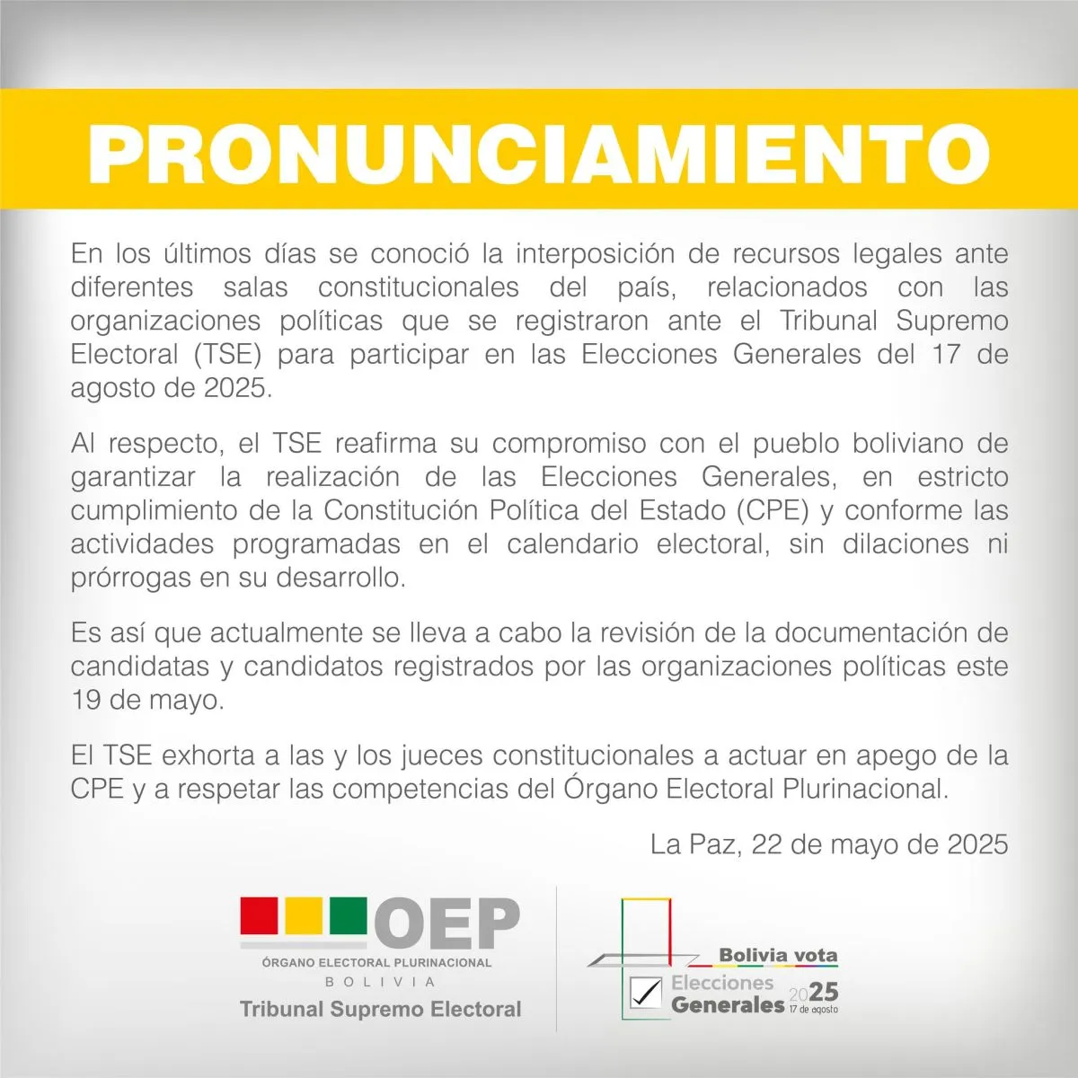 Ante la presentación de 10 recursos interpuestos ante la justicia contra frentes políticos que participan en los comicios de agosto, el Tribunal Supremo Electoral (TSE) reafirmó su compromiso de garantizar la realización de las Elecciones Generales de 2025 y exhortó a los jueces constitucionales a actuar en apego a la Constitución Política del Estado (CPE) y a respetar las competencias del Órgano Electoral Plurinacional (OEP).